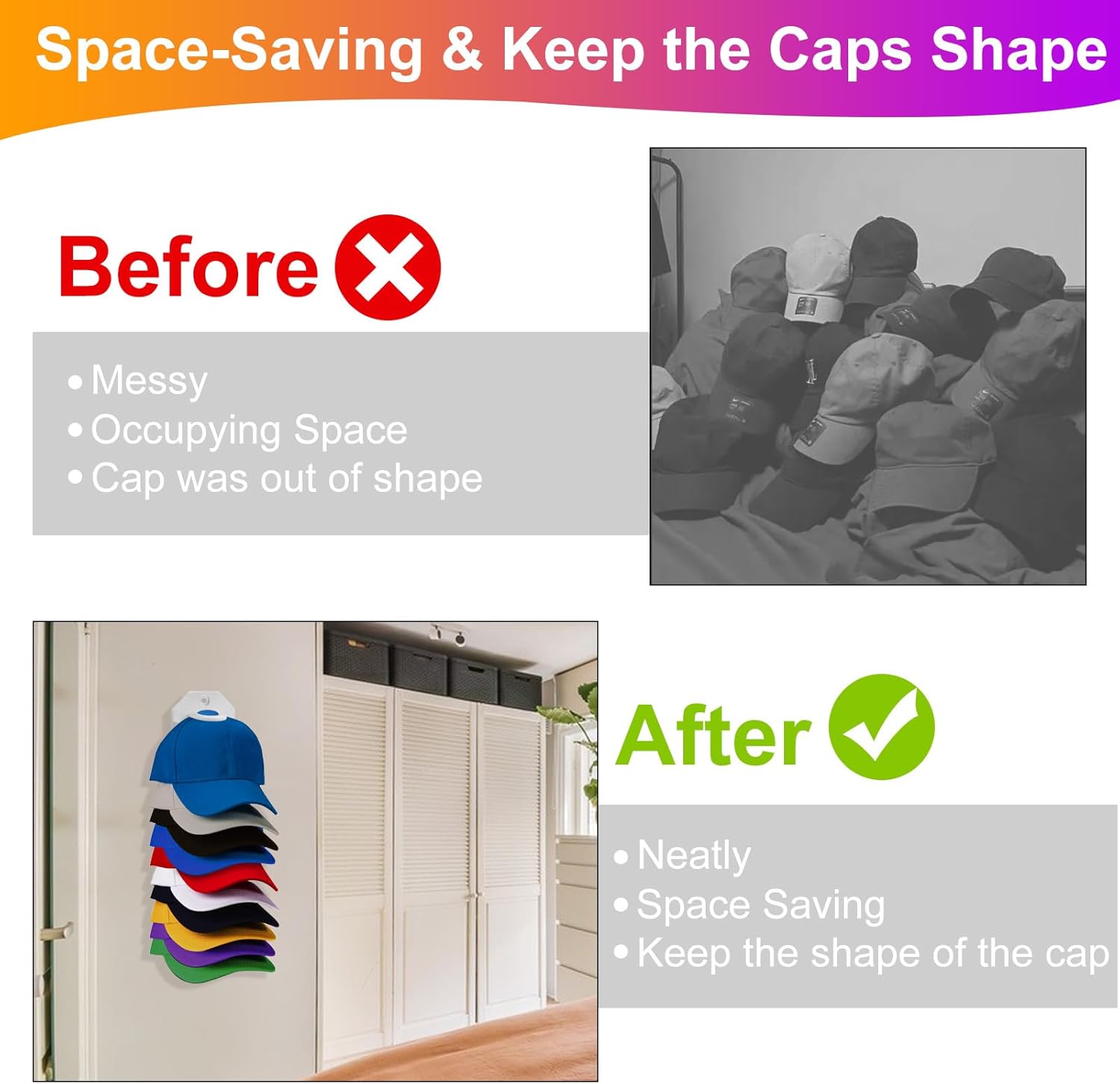 Holds up to 20 Caps: 2-Pack hat racks, each hat rack can hold up to 10 caps. Unlike other hat hooks, our hat rack doesn’t need to stack all the hats on the same layer. The hat organizer is designed to hang one cap on each layer for easy to access. The upgraded hat rack has wider adjacent layers and adds brackets on both sides to keep the shape of the hat and avoid messy deformation. The ball cap rack saves space while having a large hat storage capacity.