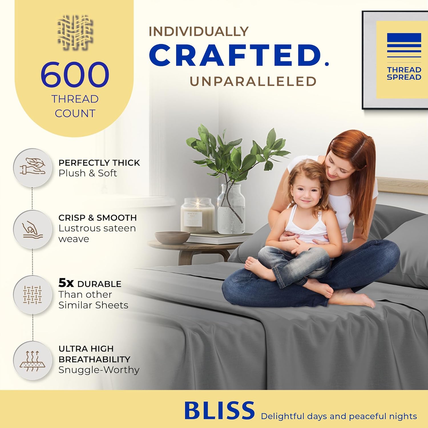 Thread Spread Egyptian Cotton Sheets Queen Size That Are Super Smooth & Silky: Treat your home to a 5 Star Hotel Experience with our PREMIUM 600 HIGH THREAD COUNT sheet set. Made from 100% extra long-staple cotton and a lustrous sateen finish, our queen sheet set is buttery smooth, thick, and crisp for a heavenly feeling. These queen sheet set cotton are breathable to keep you cool in the summer and cozy during winters for ultimate comfort all year-around