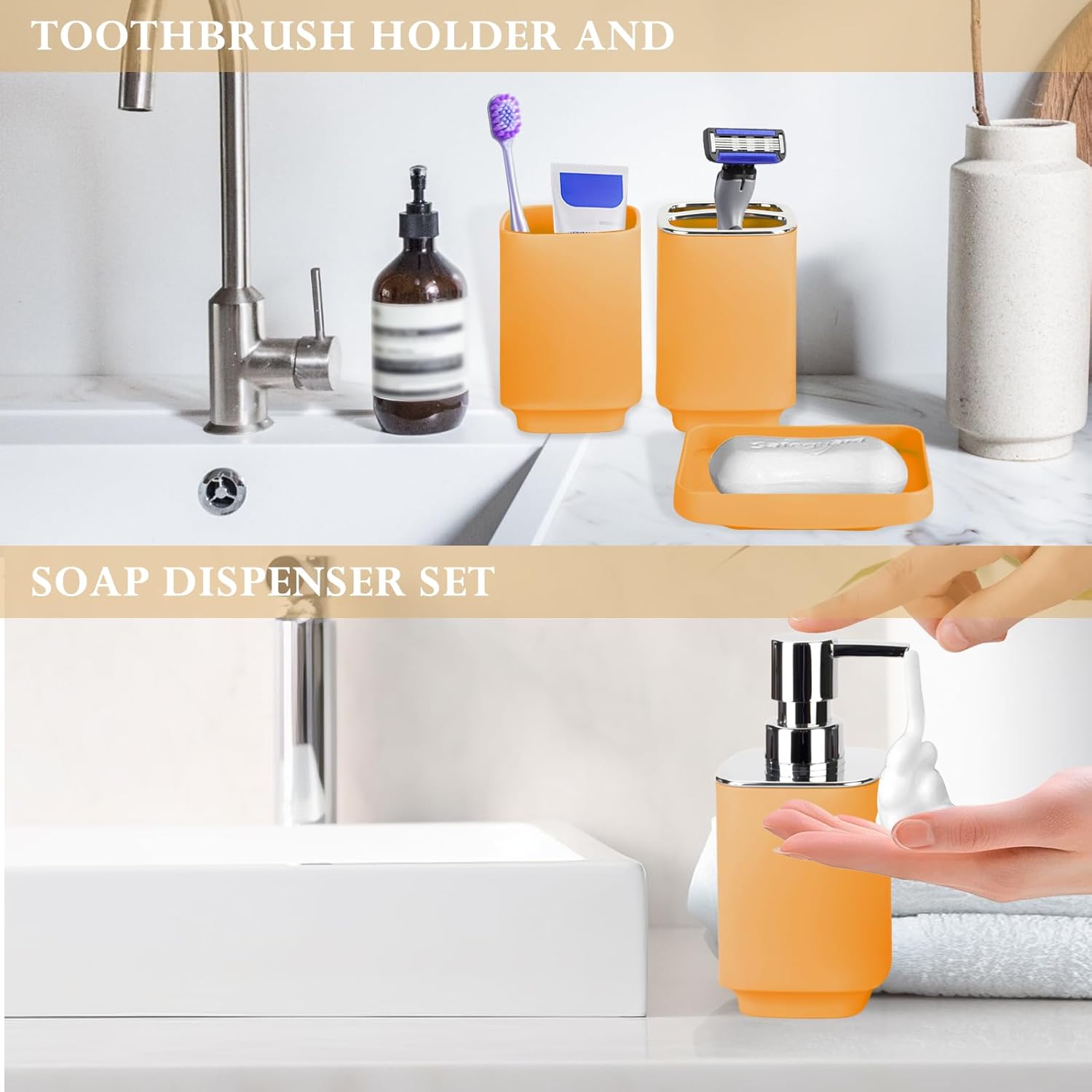 Soap dish is made of high quality material, easy to clean and hygienic.Toothbrush cup features a non-slip base to ensure stable placement and avoid tipping. Toothbrush holder has separate slots for 2-3 toothbrushes, tooth paste tubes, razors and makeup brushes.Soap dispenser is designed with a leak-proof soap pump that dispenses liquid quantitatively, saving resources and making it easy to use.