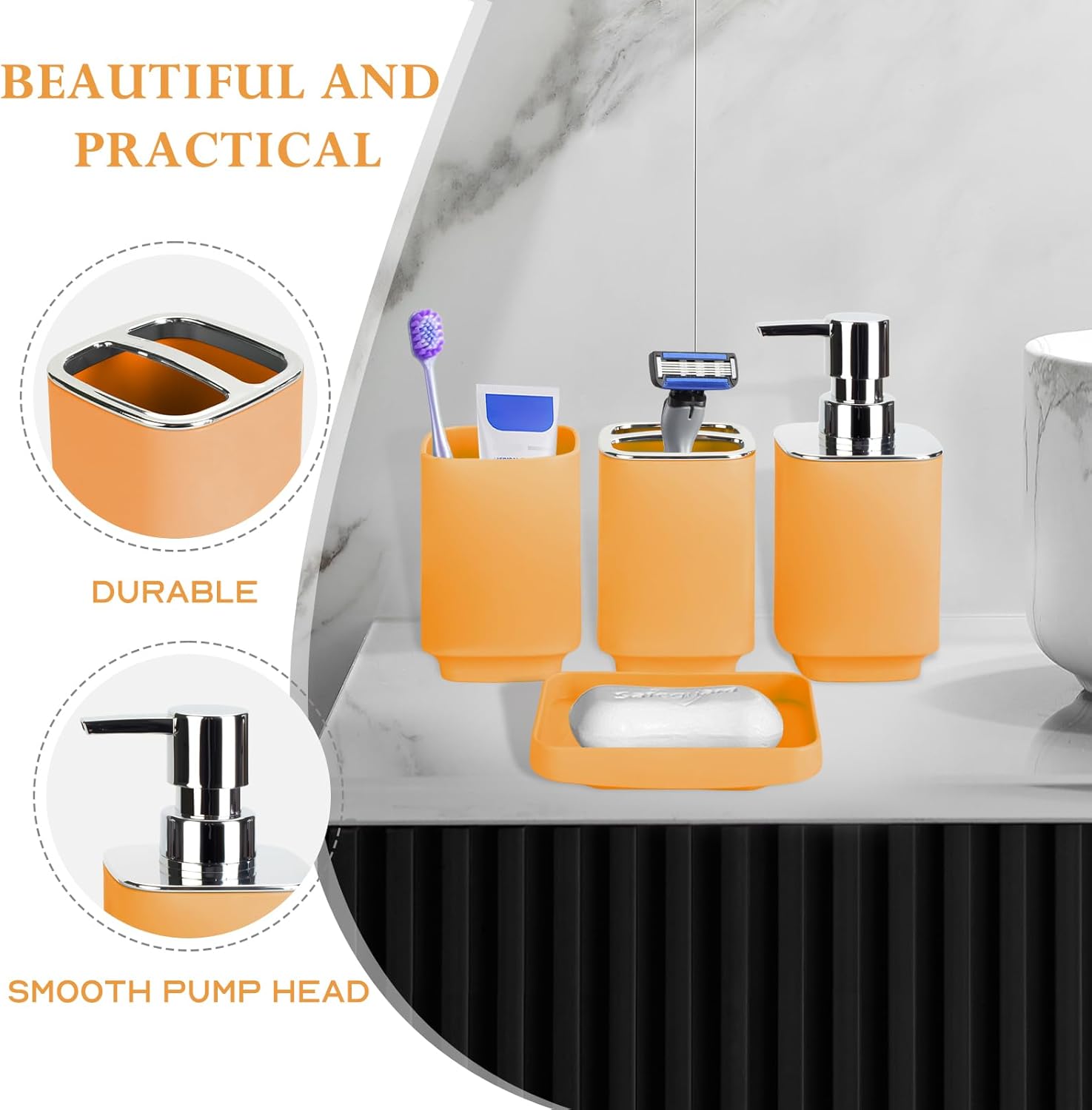 High Quality Material: Our bathroom sets accessories is made from sturdy polyresin, making it durable and resistant to wear and tear. The pump head of the soap dispenser is rust and fade resistant