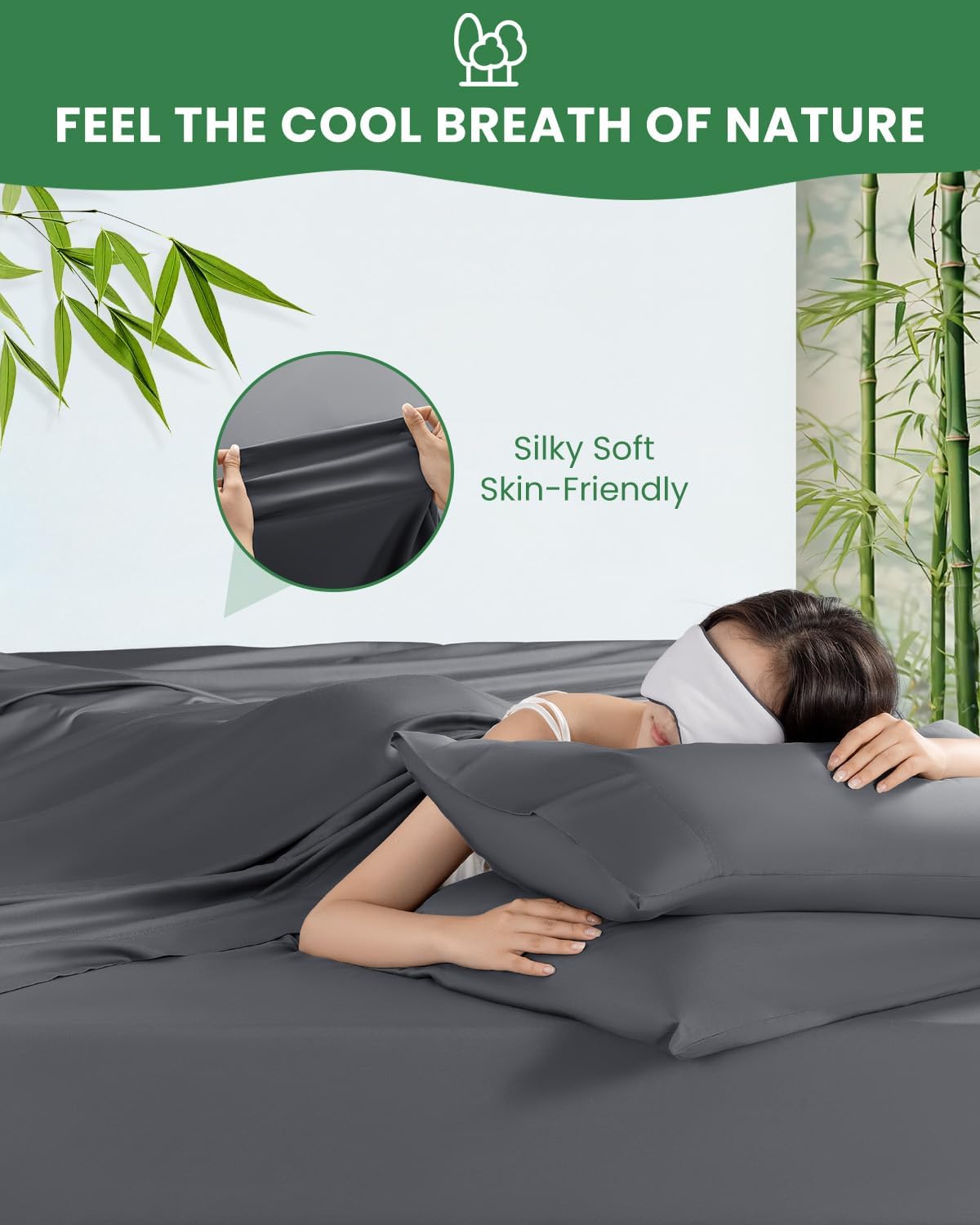 100% Viscose Derived from Bamboo_Sheets Queen Size 4pcs, Cooling & Breathable Bed Sheets for Hot Sleepers, Hotel Luxury Silky Bedding Sheets, 16″ Deep Pocket(Dark Grey)