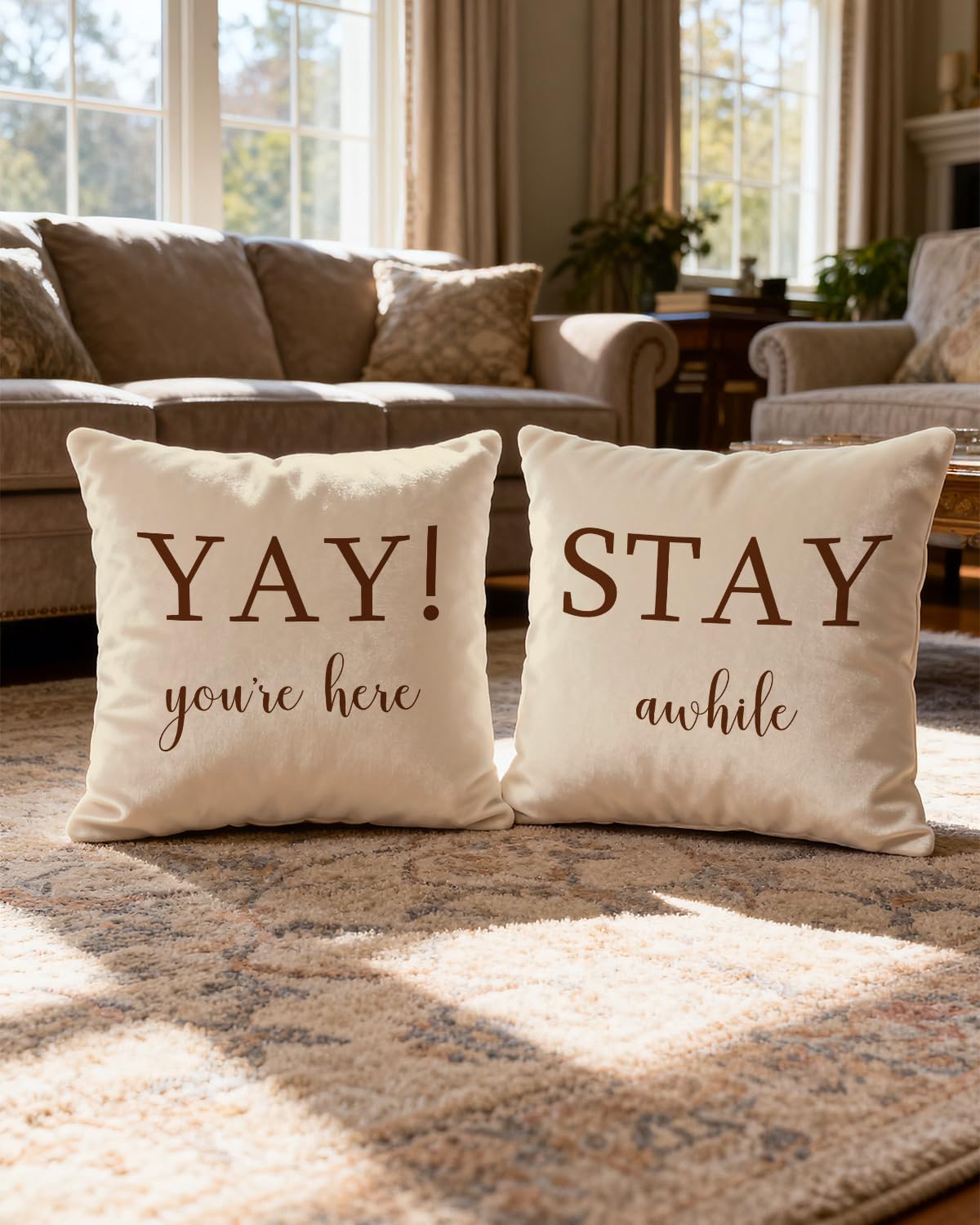 Welcome your guests with warmth and charm using these Farmhouse Pillow Covers. This 18×18 set of two features friendly messages — “Yay! You’re Here” and “Stay Awhile” — printed in stylish brown script on a soft neutral background. Perfect for entryways, living rooms, or couches, they create a cozy, rustic atmosphere that complements farmhouse, cottage, or modern boho decor. Each pillow cover is crafted from super soft, durable fabric and finished with a hidden zipper for a clean, elegant look. Add this set to your home and let your decor speak a welcoming message to everyone who enters.