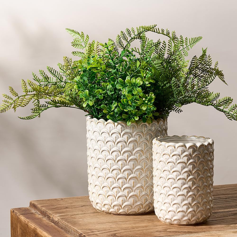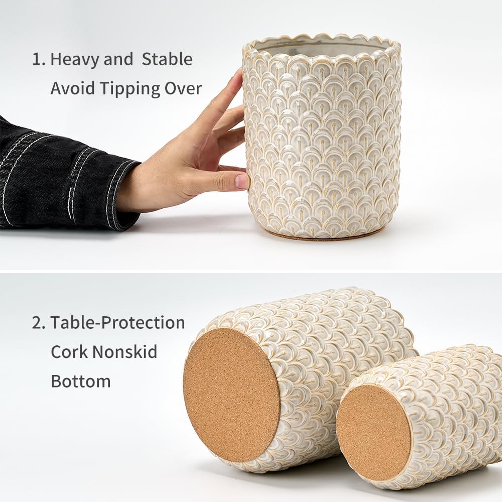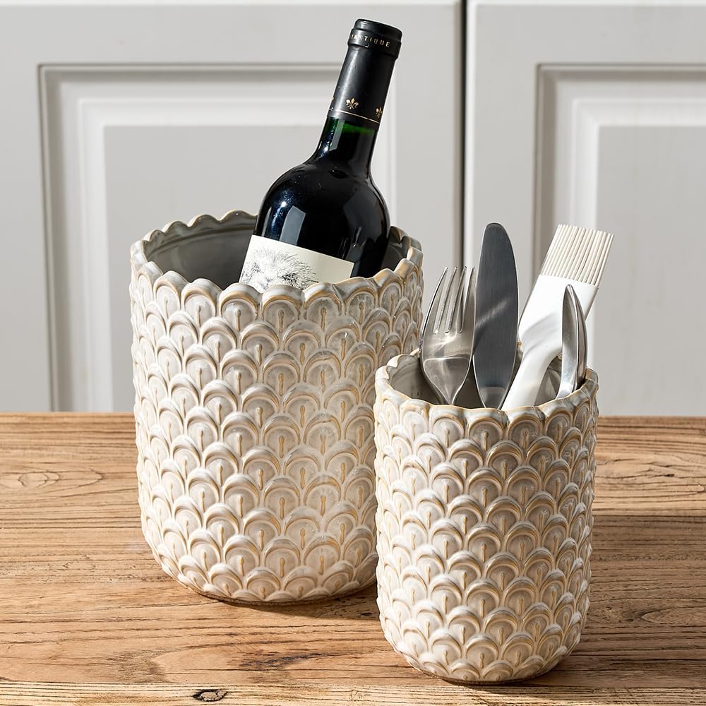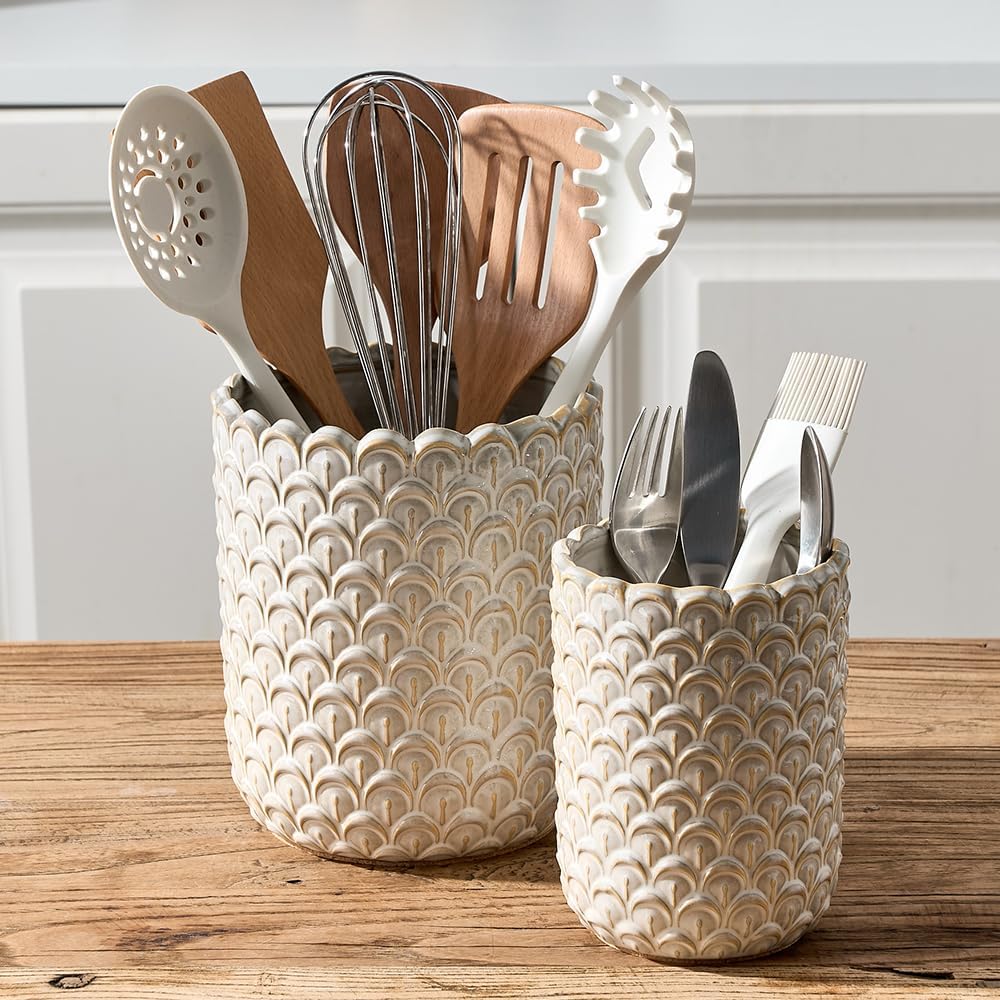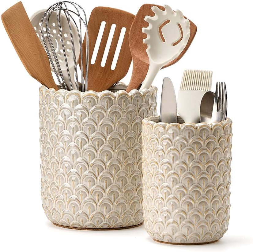 Two Sizes In One Set: Our ceramic utensil holder set comes in two sizes to meet your different storage needs. The large size (6.3″ W x 7.5″ H) is perfect for accommodating larger or longger cooking utensils, like store 10-15 spatulas and ladles. The small size (4.5″ W x 6.2″ H) is ideal for storing 5-10 knives, forks, spoons, stirrers,etc. Make utensils organized and easy to find, give you a neat and tidy kitchen.