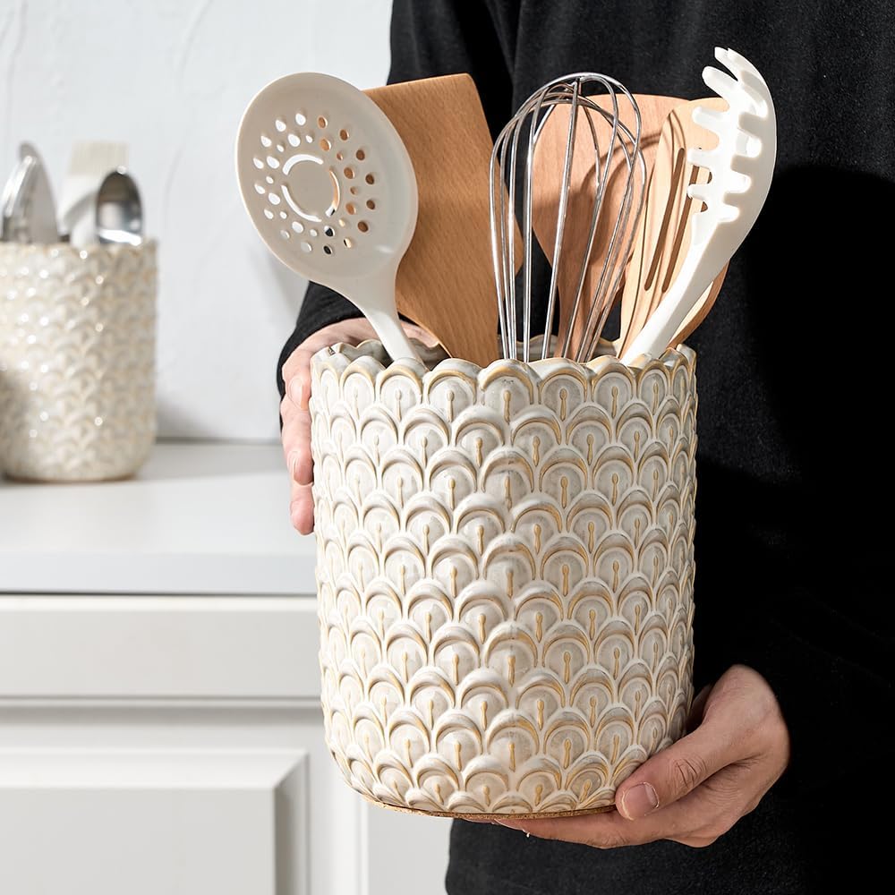 Stable & Durable Utensil Crock: Unlike common metal or stainless steel utensil holders, this ceramic kitchen utensil holder is heavy and stable, avoiding utensils from falling and spilling all over the kitchen.