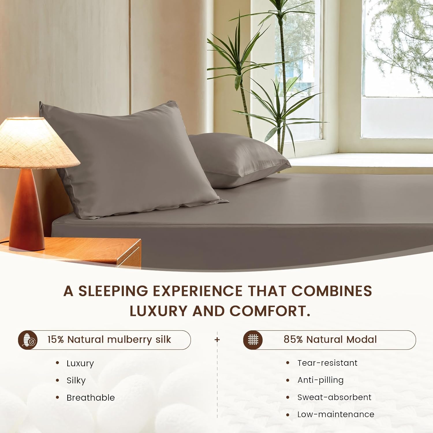 15% MULBERRY SILK & 85% MODAL:Silk Sheet Set is made from natural grade 6A+ mulberry silk blended with plant cellulose. It is Oeko-Tex certified and made from pure plant materials. No chemical ingredients are added, and you’ll feel like you are in nature when you fall asleep.