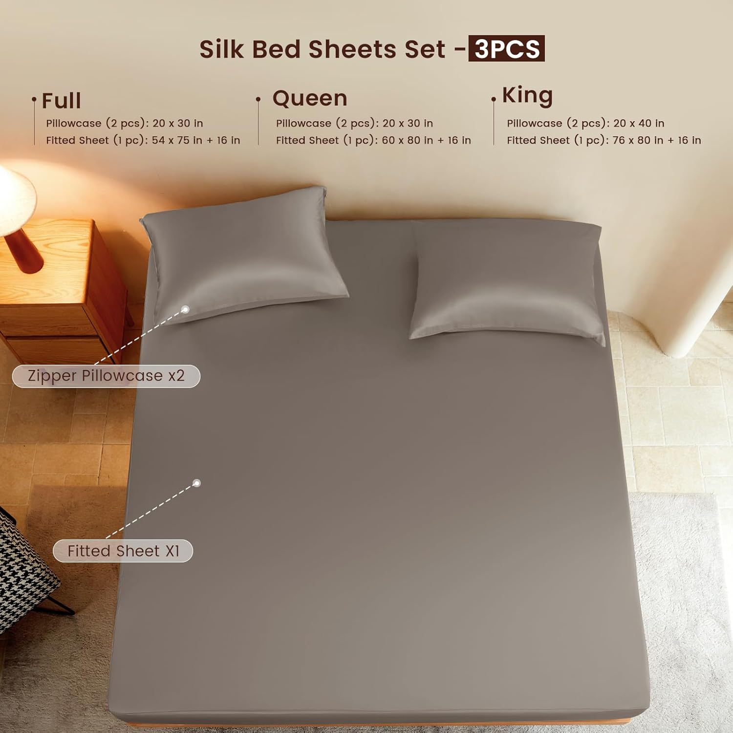 QUEEN SIZE BED SHEETS SET 3 PCS: Silk Sheets Set includes 1 Fitted Sheet(60in x 80in, 16in deep pocket), 2 Pillowcases with zipper closure(20in x 30in).