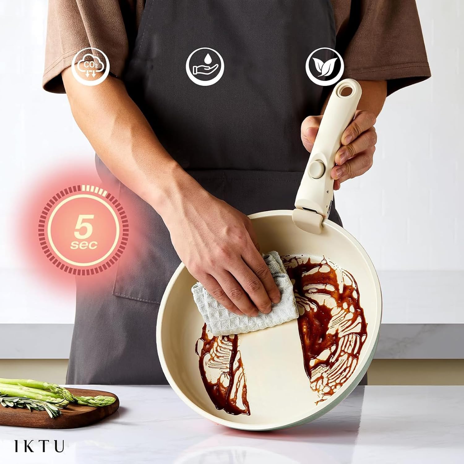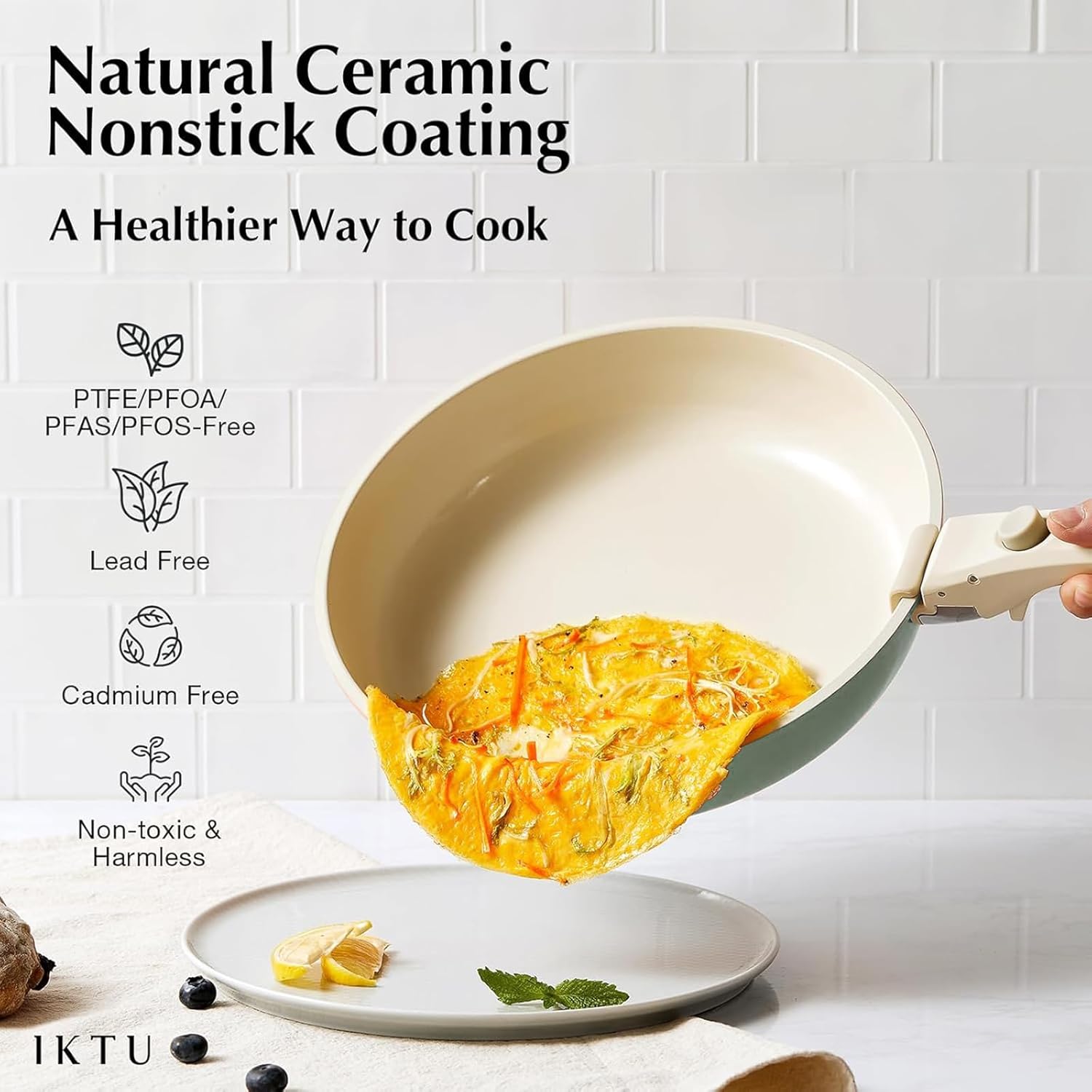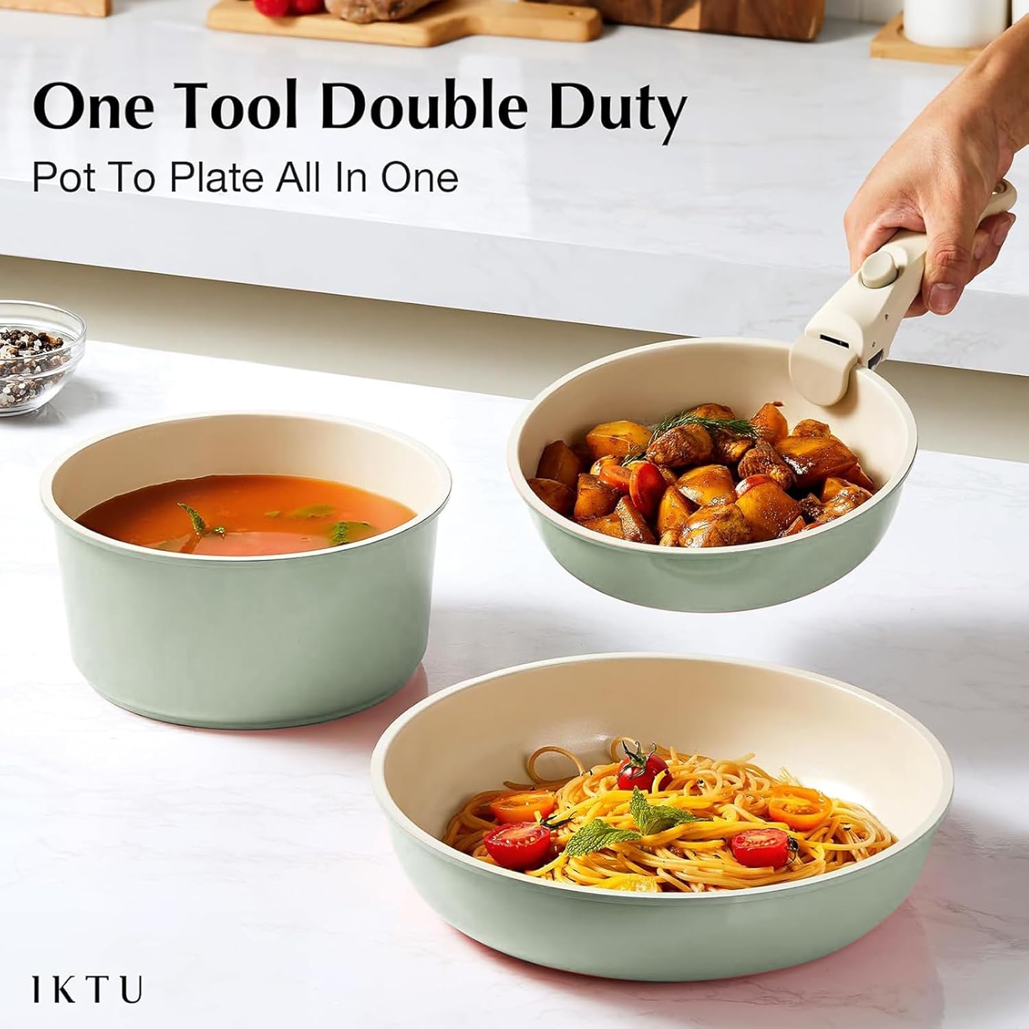 Transform the ceramic cookware set into elegant tableware instantly—simply remove the handles to serve pasta, oatmeal, or stews directly on the table, blending style with practicality.Friendly Tip: To preserve the pristine coating of your ceramic cookware set, avoid using metal utensils or sharp tools inside the pots and pans.