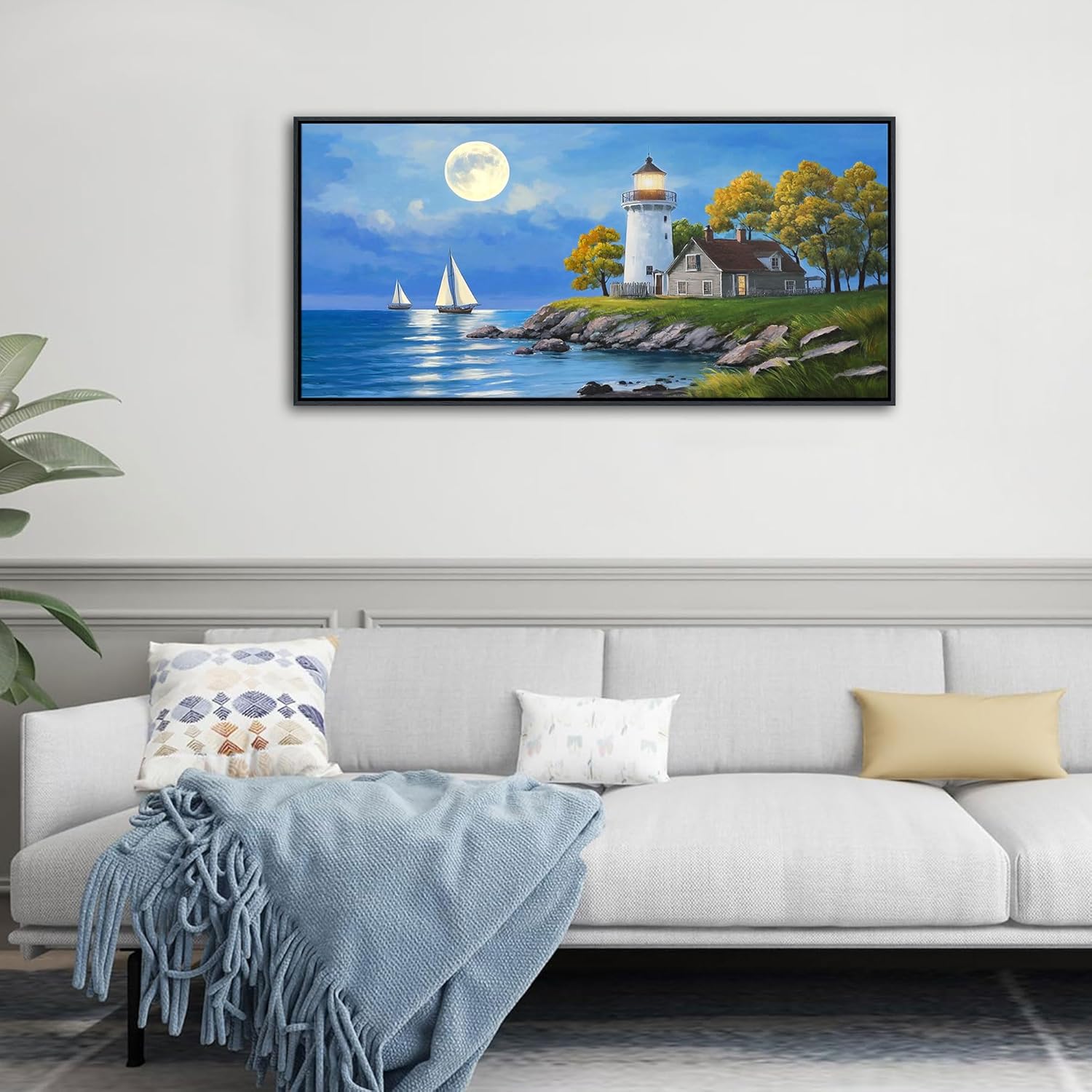 Beach Pictures Wall Art: This canvas wall art presents a picturesque coastal landscape with a lighthouse, quaint house, and sailboats under a full moon. The serene ocean, combined with the warm glow from the lighthouse and house, creates an idyllic and inviting scene that brings the charm of seaside living into your home.