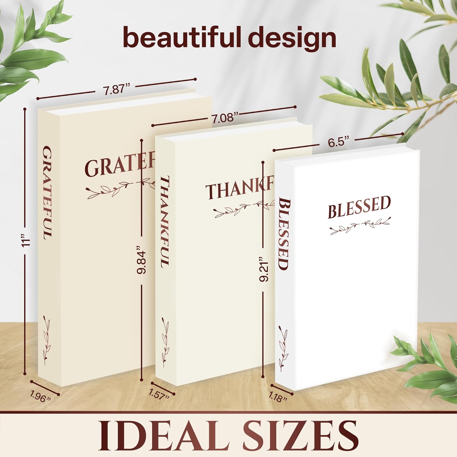 (THE SET INCLUDES) by purchasing our book decor you will get 3 box books of different sizes (Book 1:H11x L7.87x W1.97 inches. Book2: H9.84x L7.09x W1.57 inches and Book3: H9.21x L6.50x W1.18 inches). Designer books decor set material Reinforced and strong cardboard.