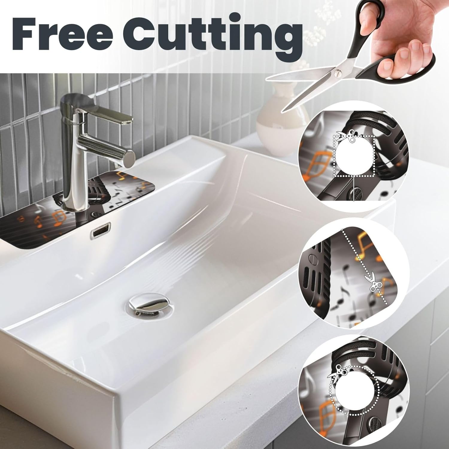 Faucet Splash Guard for Bathroom Counter Dimensions: 15″ x 5.5″ with a 2.5″ diameter faucet hole, this splash guard fits most standard faucets in kitchens, bathrooms, RVs, and more to keep clean and dry. The flexible material can be trimmed for custom fitting. Perfect sink accessories