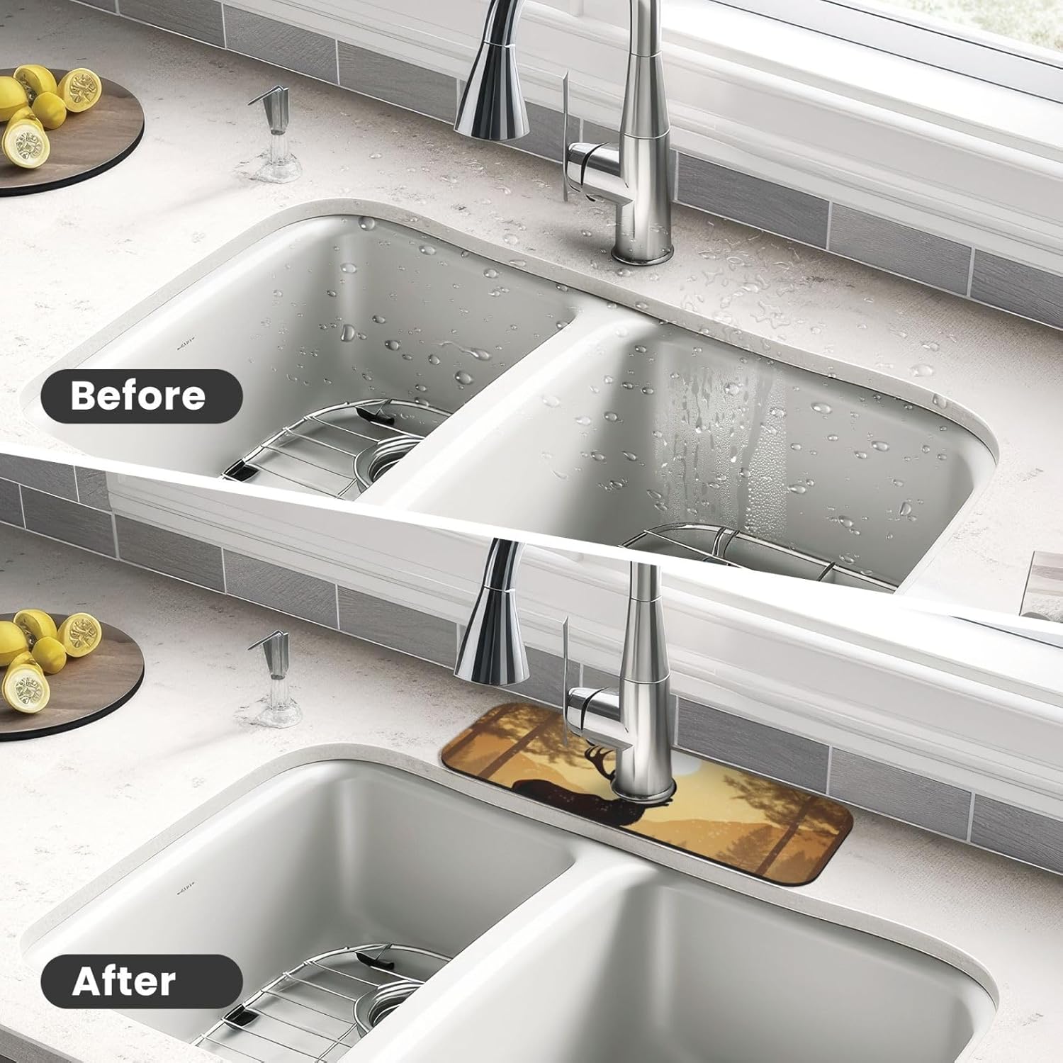 Easy Installation and Maintenance: Simply slide it around your faucet, and it stays firmly in place. Lightweight and easy to handle, the Kitchen Sink Mat Sink Faucet Mat with Faucet Water Catcher Mat requires minimal cleaning and dries quickly, freeing you from constant countertop wiping