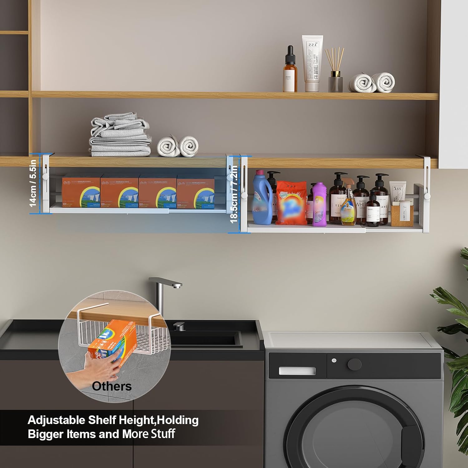 [Adaptive Size] Dimension: 14.9~22.6L*10.1W*5.5H inches, , you can place under shelf storage basket in any conventional cabinet size,Adaptation to your cabinets
