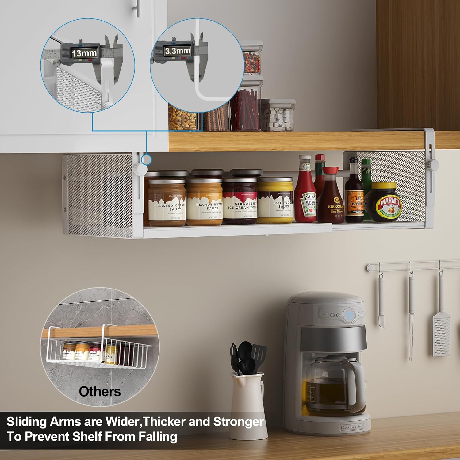 [Stable and Not Inclined]:In order to prevent the basket from tilting, the arm is widening to 13mm and thickened to 3.3 mm.The adjustable arm height allows undershelf storage basket and cabinets integrate, making the hanging under shelf more stable. , dual protection so it will not tilt or fall!