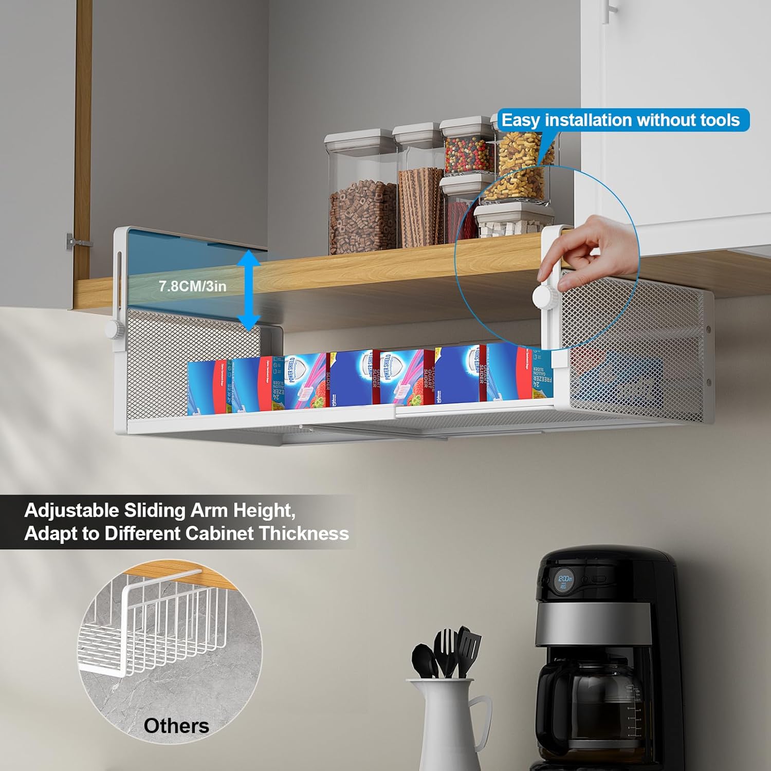 [0-3Inches Adjustable Hanging Arms] under cabinet basket 0-3″(7.6cm)adjustable hanging arms , to Storage your kitchen items, such as Cans, spices, cups, condiments, bottles, snacks, plates, food wrappers, bags, tools, towels, boxes, napkins, dish towels, cutlery, bathroom accessories, aluminum foil, clothing, plastic wrap, books