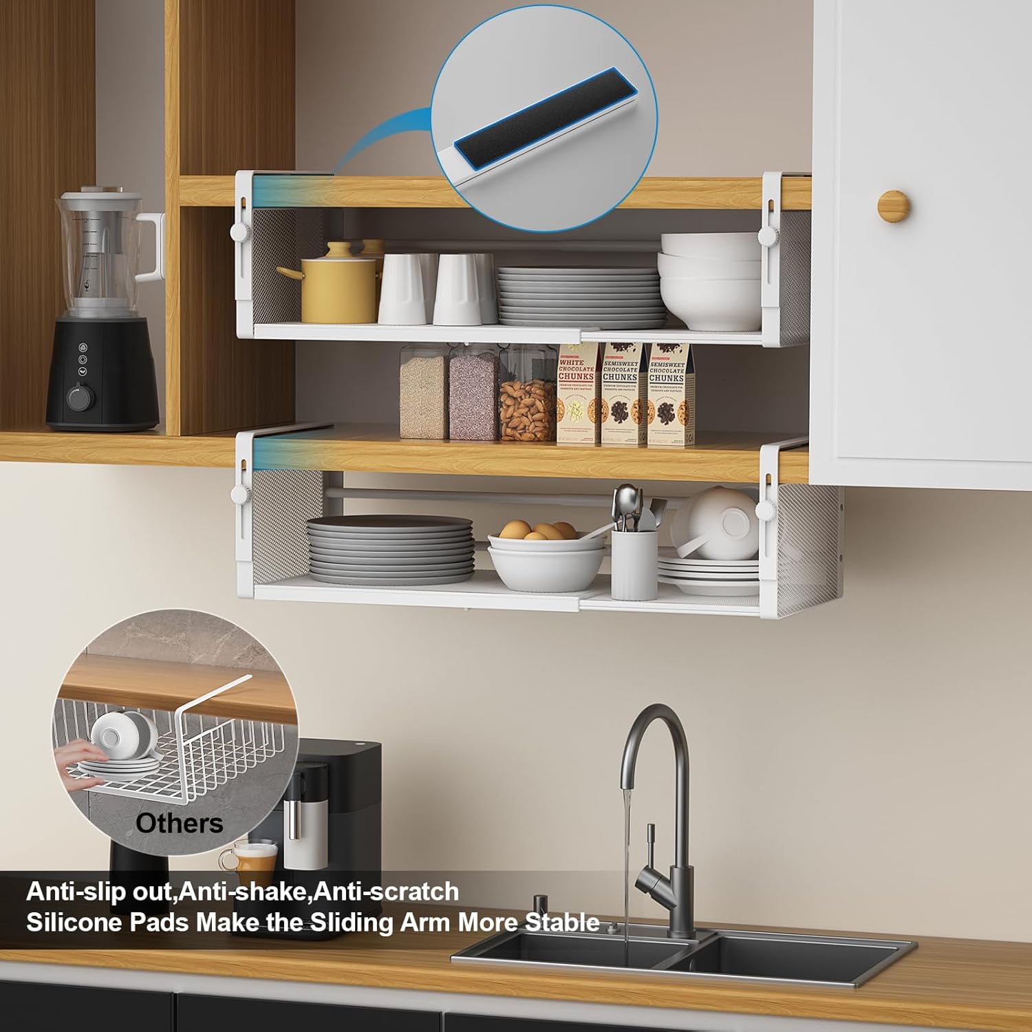 [Easy Assembly]:Fits most cabinets—requires a coin-thick gap for door to close tightly. No need to use any tools, the hand twist screw design can easily adjust the height of the sliding arm to adapt to your cabinet thickness.Anti-slip pads are added to the hand screw fit to prevent the screws from slipping.