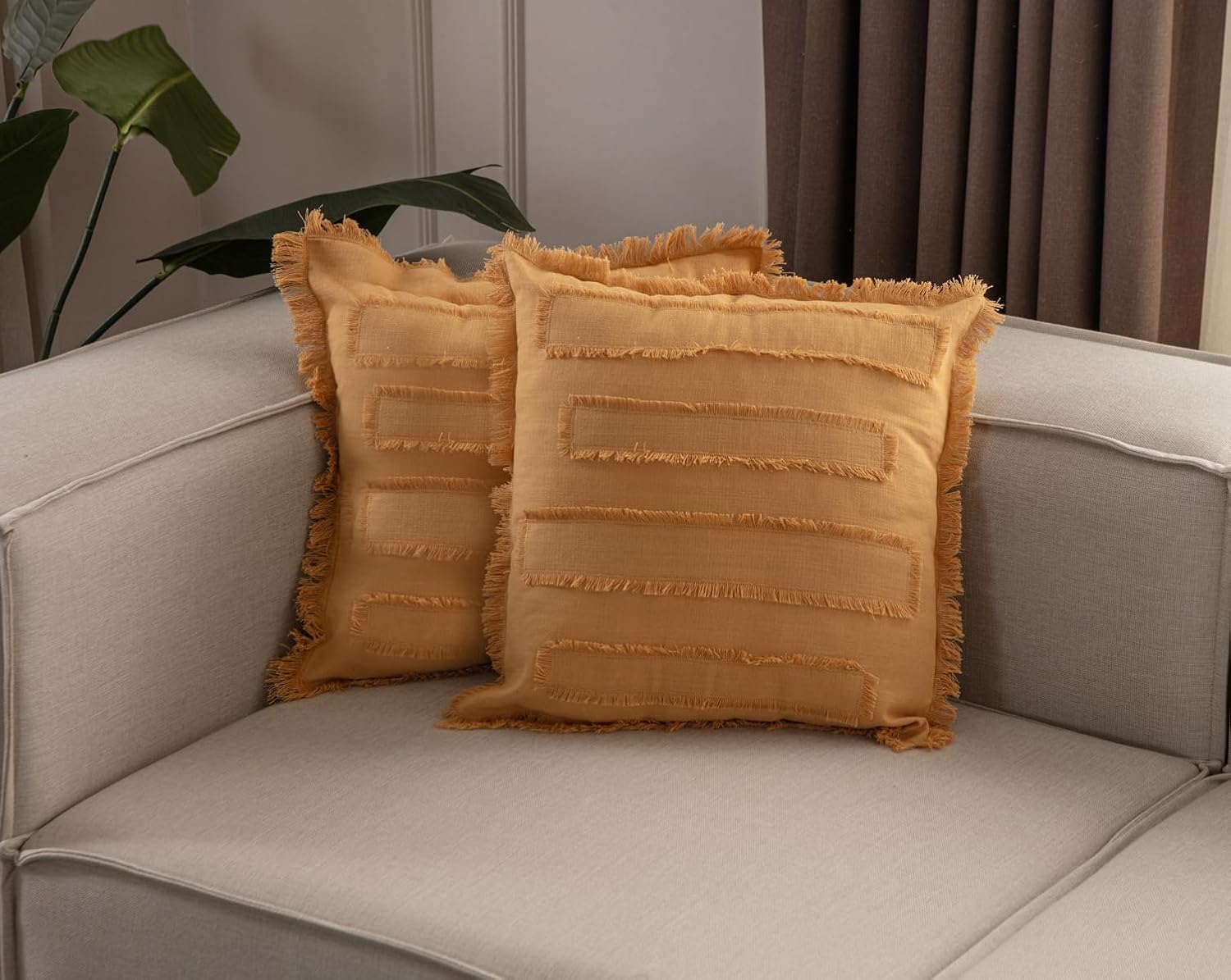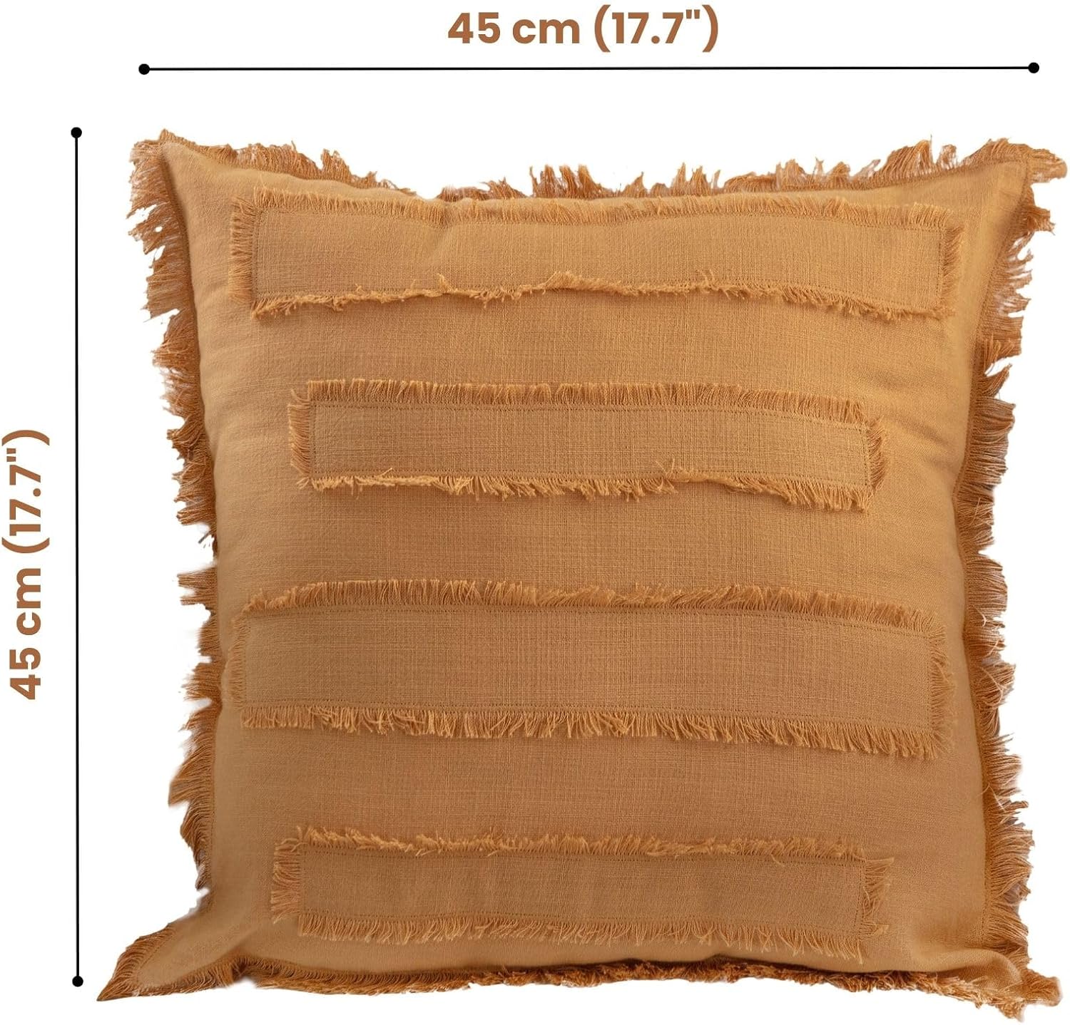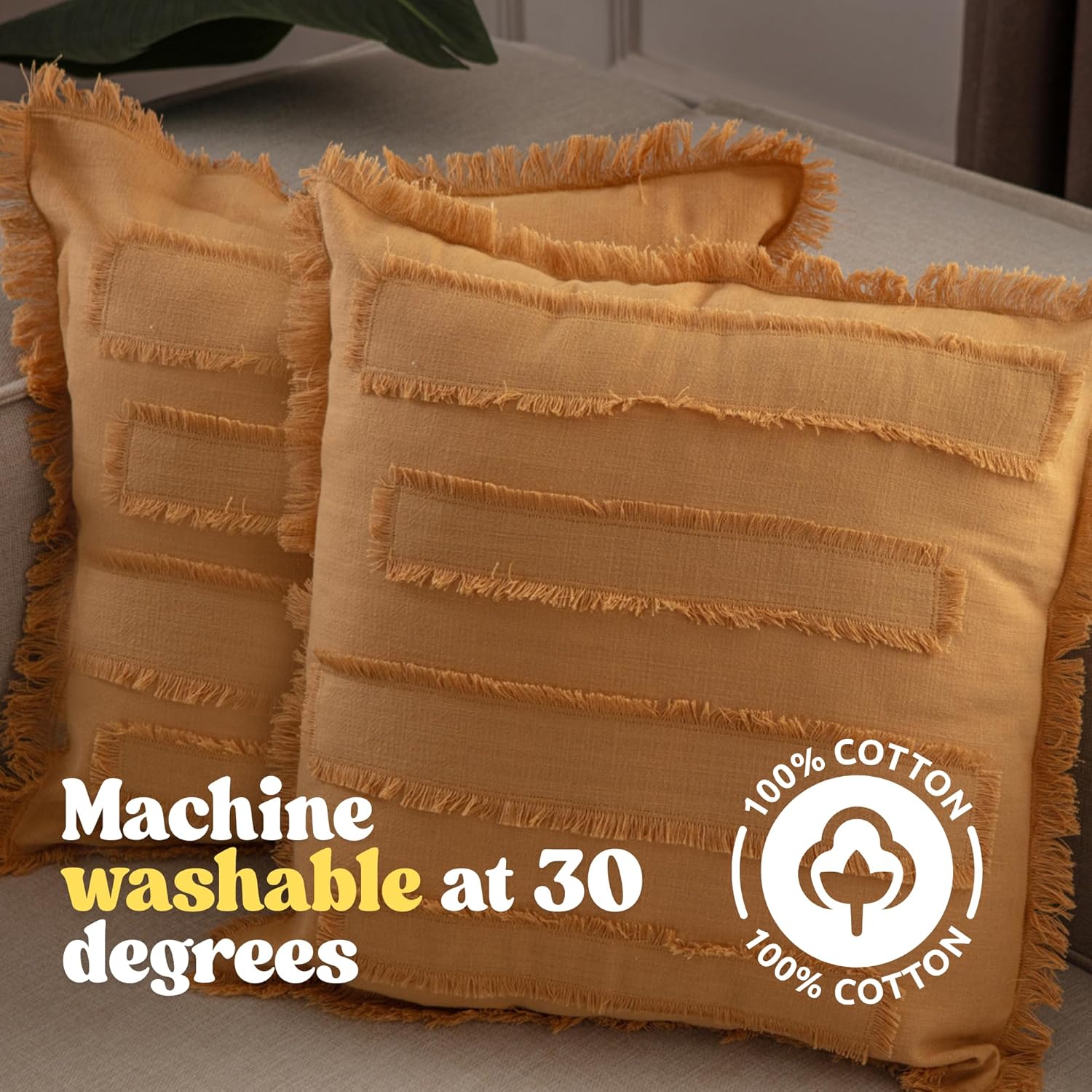 100% PREMIUM COTTON: These cushion covers are made from high-quality, pure cotton fabric, offering a soft, breathable, and durable finish for everyday comfort. HANDMADE GEOMETRIC DESIGN: Skillfully handcrafted with unique tassel-fringed geometric patterns in a warm Amber tone, adding a touch of modern elegance to your sofa, bed, or armchair.EASY TO CLEAN: Machine washable at 30 degrees, these sofa cushion covers and throw pillows are practical and easy to care for long-lasting beauty.THOUGHTFUL GIFT CHOICE: Carefully packaged and perfect as a stylish housewarming gift, these decorative sofa pillows bring warmth and charm to any living space.