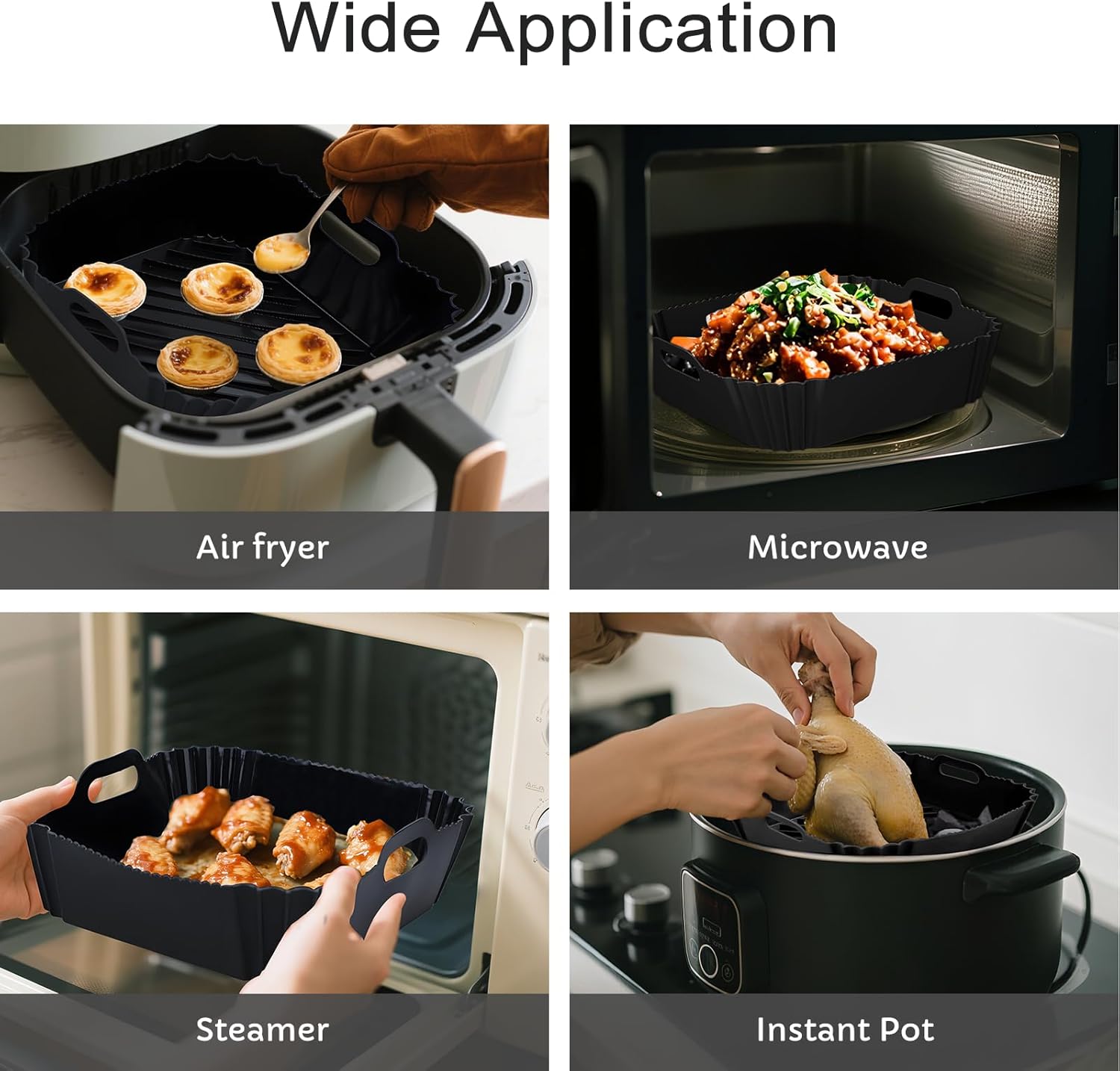 Awesome Silicone Liner: The square silicone air fryer liners are suitable for 4-7QT air fryers. 8.6×7.8 inches at the top, 7.1×7.1 inches at the bottom, and 2.3 inches in height. Our air fryer silicone liners are higher and can fill the air fryer well. Compatible with Ninja, Cosori, Gowise, Gourmia, Cuisinart, Chefman, Nuwave Instant Pot air fryer