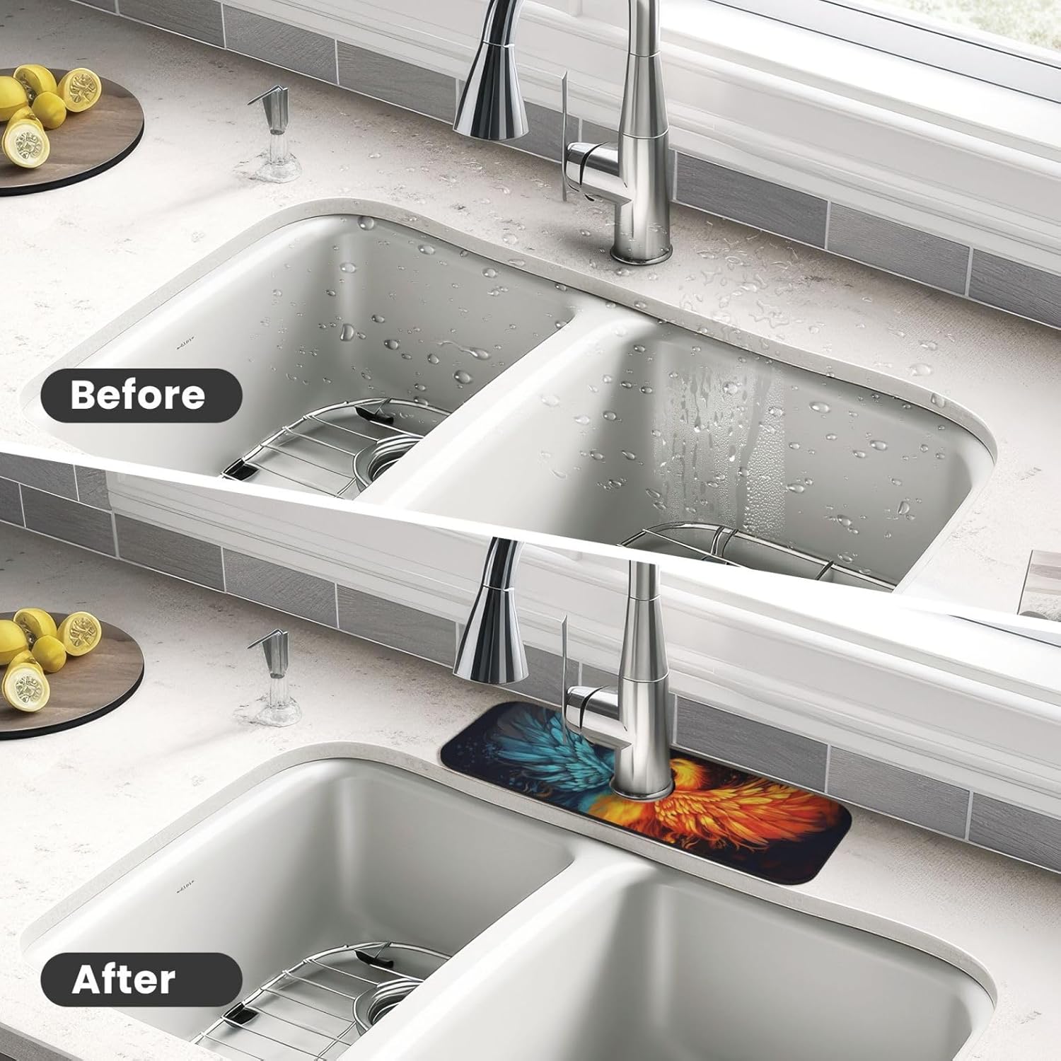 Easy Installation and Maintenance: Simply slide it around your faucet, and it stays firmly in place. Lightweight and easy to handle, the Kitchen Sink Mat Sink Faucet Mat with Faucet Water Catcher Mat requires minimal cleaning and dries quickly, freeing you from constant countertop wiping