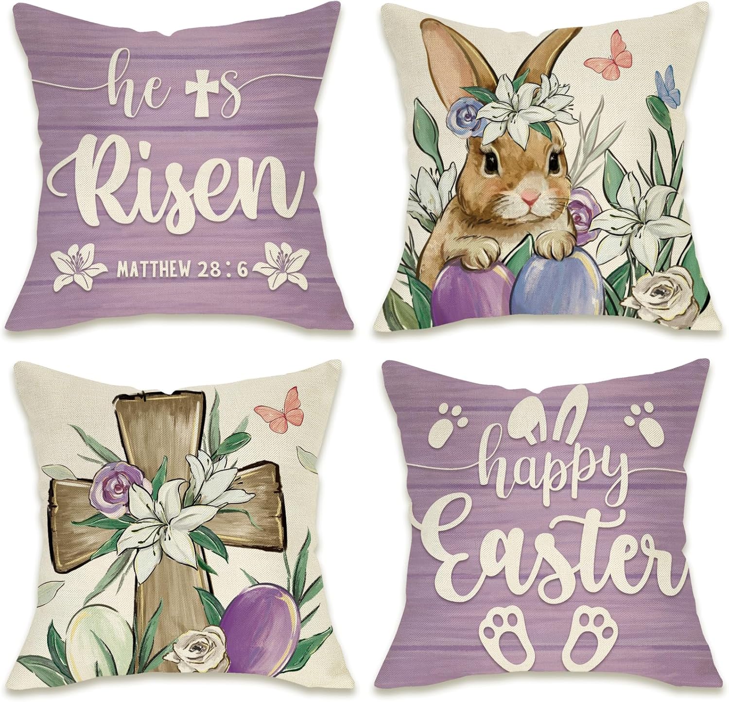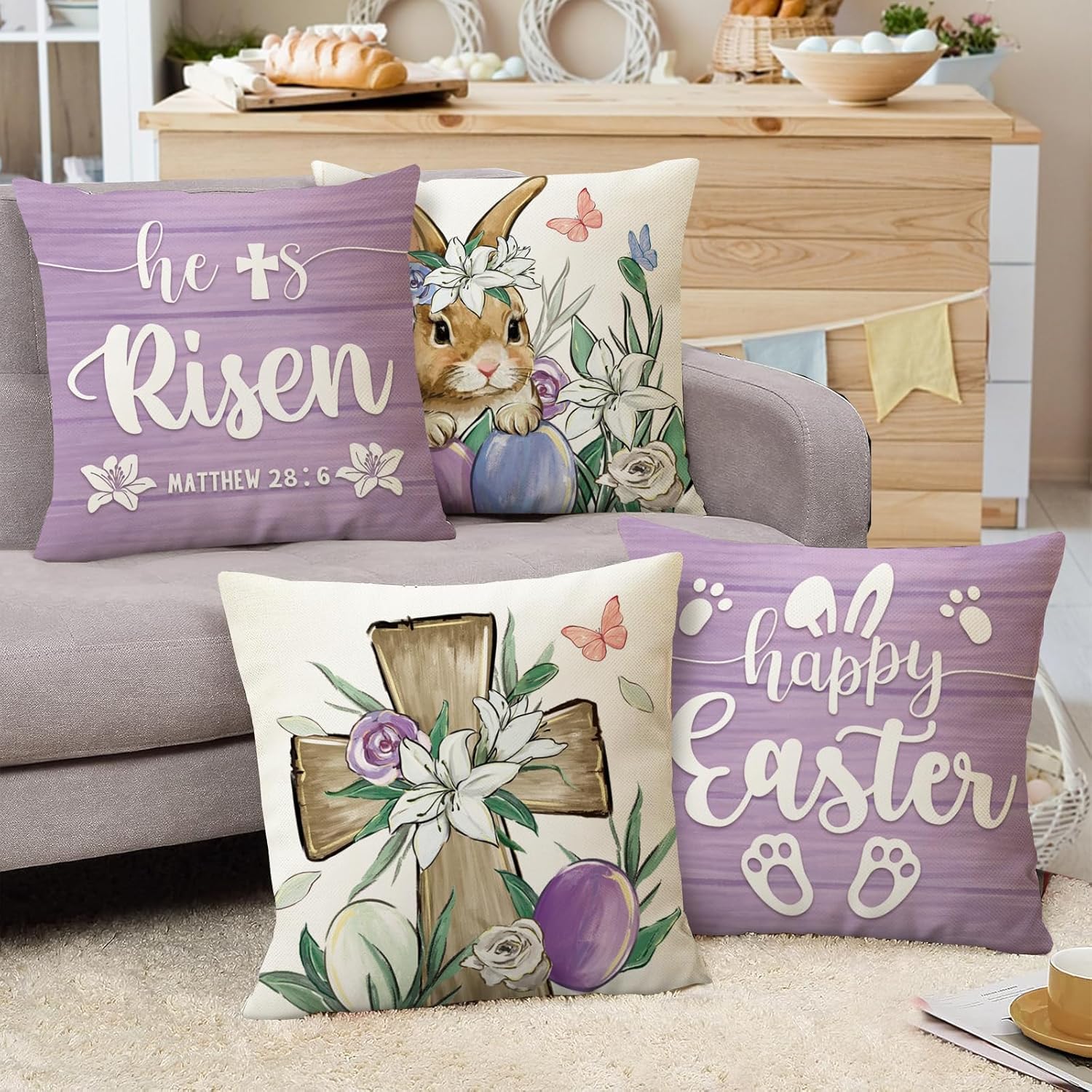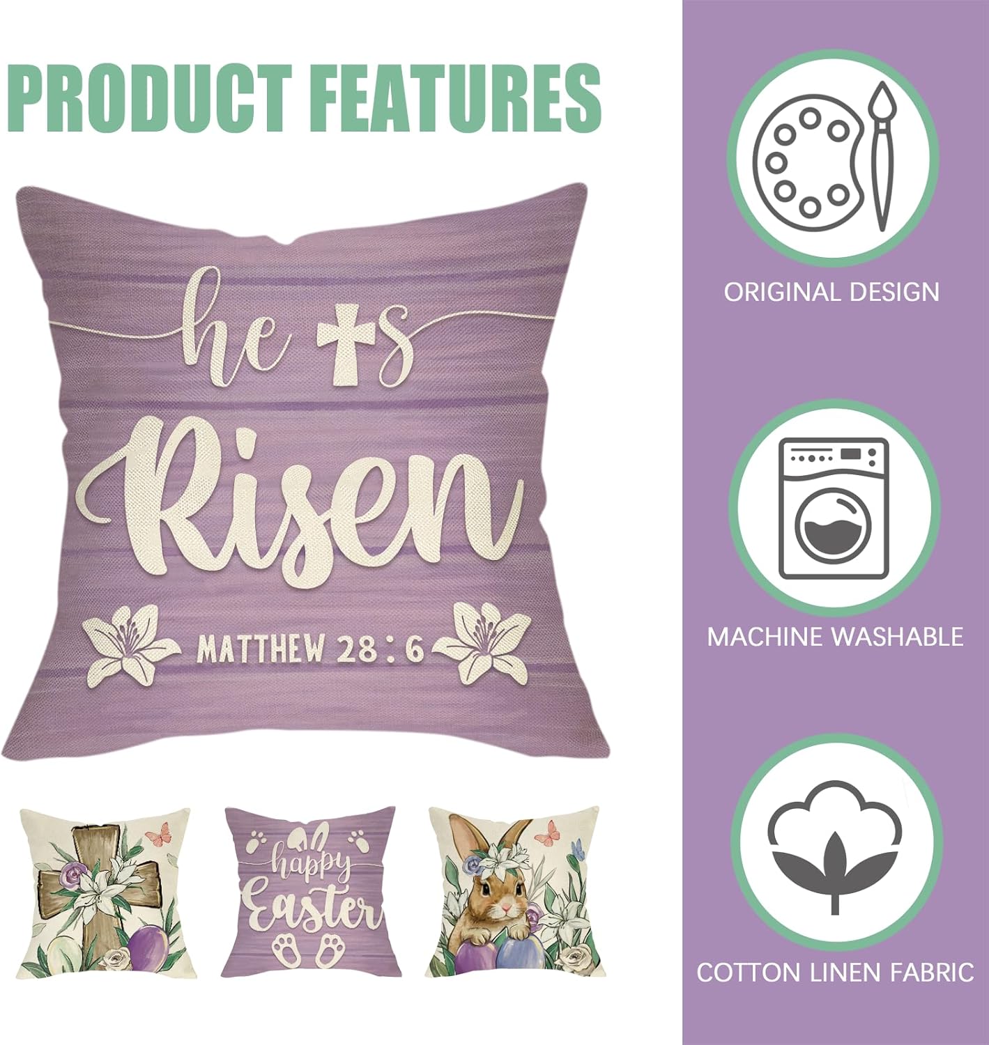 Attractive Design: This series of 4-piece pillowcase is designed with bunny, cross, lily, Easter egg, butterfly patterns. These pillowcases are also printed with words such as Happy Easter, he is risen. They are very suitable for decorating the inside of your room in Easter and also perfect for decorating outside the house, such as courtyard porches