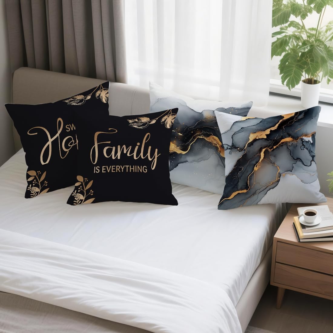 OBSEDE Black Gold Marble Sweet Home Throw Pillow Covers 18 × 18 in, Set of 4, Couch Cushion Cases Inserts for Sofa Bed Living Room Home Decor, Single-Sided Print